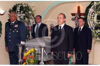 MEXICO D.F., 04FEBRERO2009.- En primer plano Guillermo Galván Galván, Secretario de la Defensa y Felipe Calderón Hinojosa, Presidente de México, al fondo se aprecia a Genaro García Luna, Secretario de Seguidad Pública Federal y Eduardo Medina Mora, Procurador General de la República, durante una guardia de honor ante el feretro de el General de Brigada Mauro Enrique Tello Quiñonez, quien fue emboscado junto con sus escoltas en una carretera cerca de Cancún, Quintana Roo. Los restos del militar son velados en la funeraria ubicada dentro de las instalaciones del Campo Militar Número 1. FOTO: FRANCISCO SANTOS/CUARTOSCURO.COM
