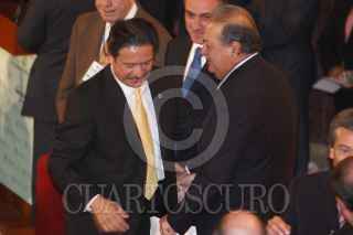 MÉXICO, D.F., 09FEBRERO2009.- Carlos Navarrete Coordinador de la fracción parlamentaria del PRD saluda al empresario Carlos Slim durante el Foro México ante la crisis qué hacer para crecer, realizado en la Cámara de Diputados. FOTO: CUARTOSCURO.COM