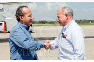VILLAHERMOSA, TABASCO, 12FEBRERO2009.- El Presidente de México, Felipe Calderón Hinojosa es recibido por el gobernador tabasqueño Andrés Granier Melo en el aeropuerto local. Para la inauguración de las obras del libramiento vial que se ubica sobre la ranchería Emiliano Zapata. FOTO: MARCO POLO GUZMÁN HERNÁNDEZ/CUARTOSCURO.COM