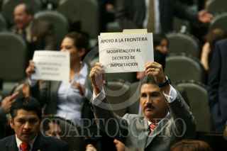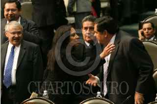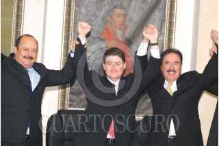 MÉXICO D.F., 12FEBRERO2009.- Los diputados del PRI, César Duarte Jáquez y Emilio Gamboa Patrón, levantan los brazos en forma de triunfo al candidato por la gobernatura de Nuevo León, Rodrigo Medina De la Cruz quien se reunio con diputados de este partido momentos antes de dar inicio a la sesión en la Cámara de Diputados. FOTO: GUILLERMO PEREA/CUARTOSCURO.COM