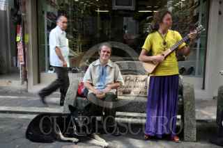 VILLAHERMOSA, TABASCO, 13FEBRERO2009.- Una pareja de enamorados originarios del estado de Colorado Estados Unidos junto a su perro Pastar Alemán cruza Alaska de nombre Bear emprendieron un largo viaje desde su ciudad natal con la única finalidad de conocer las zonas arqueológicas de nuestro país pero al quedarse sin dinero a mitad de su travesía cantan en zonas públicas para obtener dinero y poder comer. FOTO: MARCO POLO GUZMÁN HERNÁNDEZ/CUARTOSCURO.COM