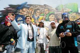 MÉXICO, D.F., 15FEBRERO2009.- El luchador Abismo Negro visitó el estacionamiento del Estadio Azteca, donde cientos de jóvenes participan en el Segundo Megaconcurso de Graffiti, organizado por autoridades del gobierno del Distrito Federal. FOTO: ISAAC ESQUIVEL/CUARTOSCURO.COM