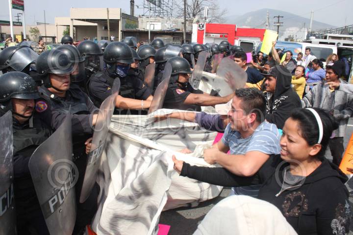 MONTERREY, NUEVO LEÓN, 17FEBRERO2009.- Por sexta ocasión en poco más de una semana y por alrededor de tres horas, los "Tapa calles" bloquearon importantes avenidas de la ciudad, ocasionando disturbios en la vía pública y provocando caos vial. Elementos de la policía estatal, y de la policía federal preventiva realizaron operativos para desbloquear las calles utilizando tanquetas lanza agua y realizaron detenciones. Declaraciones del gobernador de la entidad, señala que estos manifestante los patrocina el crimen organizado para meter presión y así se terminen los operativos militares. FOTO: PEDRO KRISTIAN LOPEZ/CUARTOSCURO.COM