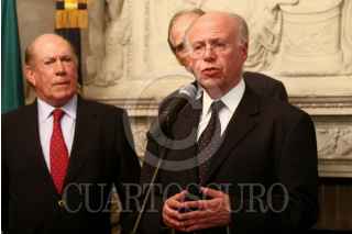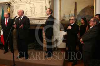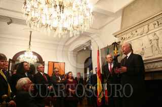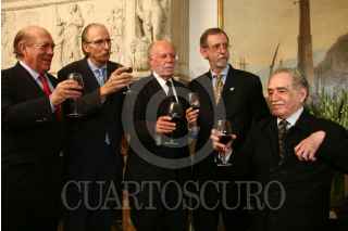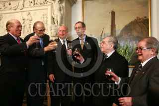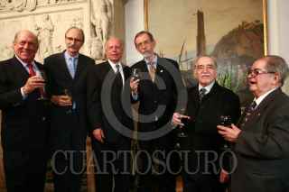MÉXICO, D.F., 19FEBRERO2009.- Antonio Suárez, miembro de la fundación Princípe de Asturias, Carmelo Angulo, embajador español, José Narro, rector de la UNAM, Franciso Bolivar Zapato, ganador del premio Príncipe de Asturias, Gabriel García Márquez, premio nobel de literatura y el historiador Miguel León Portilla, brindaron al finalizar la ceremonia en la que se dio a conocer la candidatura de la Universidad Nacional Autónoma de México a el Premio Príncipe de Asturias de Comunicación y Humanidades, en la Embajada de España. FOTO: MOISÉS PABLO/CUARTOSCURO.COM