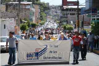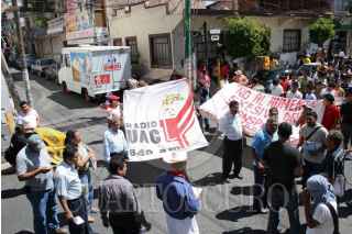 CHILPANCINGO, GUERRERO, 25FEBRERO2009.- Trabajadores de Radio UAG realizaron una marcha por las principales calles de la capital del estado quienes fueron apoyados por alumnos de la normal rural de Ayotzinapa para terminar con un bloqueo sobre la avenida Alvarez (una de las mas importantes), para exigir al rector de la maxima casa de estudios Arturo Contreras Gómez la destitución del director de dicha radiodifusora Artemio Sevilla Ortega, a quien acusan de prepotente, déspota, bloquear el trabajo del personal, desvió de recursos, de tener en nomina a su esposa e hijos, entre otras demandas mas. FOTO: OSCAR ALVARADO/CUARTOSCURO.COM