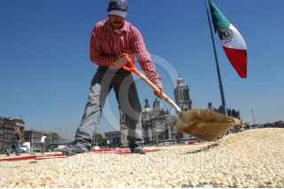MÉXICO, D.F., 26FEBRERO2009.- Miembros de la organización -Greenpeace- se manifestaron en la plancha del Zócalo Capitalino construyendo un tapiz gigantesco hecho con maíz trasgenico para manifestase en contra de este producto, este tapete tenia escrita la leyenda "Sin maíz no hay país" FOTO: LUIS CARBAYO/CUARTOSCURO.COM