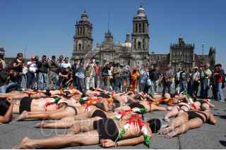 MÉXICO, D.F., 26FEBRERO2009.- Activistas semidesnudos protestaron frente a Palacio Nacional contra la posibilidad que el ejecutivo federal declare la Plaza de Toros de México como monumento artístico y patrimonio cultural de la nación, ignorando la postura de millones de mexicanos contrarios a las corridas de toros. FOTO: LUIS CARBAYO/CUARTOSCURO.COM