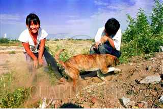 Mientras partorean sus borregos, Flor y Sebastián juegan con "el pinto" en hoyos de tierra, donde eventualmente encuentran conejos y liebres; animales que llevan a su casa para comerlos. FOTO: Juan Pablo Zamora/CUARTOSCURO.COM