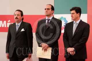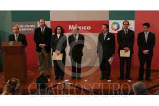 MÉXICO, D.F., 03MARZO2009.- Felipe Calderon, Presidente de México, Consuelo Sáizar Guerrero, nueva titular del CONACULTA, Sergio Vela, Luis Tellez, nuevo asesor de la Presidencia de la República, Juan Molinar Horcasitas, nuevo Secretario de Comunicaciones y Transportes, Daniel Karam Toumeh, director del Instituto Mexicano del Seguro Social y Gerónimo Gutiérrez, Subsecretario de Gobierno en la Secretaría de Gobernación, durante la conferencia de prensa en la cual se dieron a conocer los cambios en el gabinete. FOTO: SÁSHENKA GUTIÉRREZ/CUARTOSCURO.COM