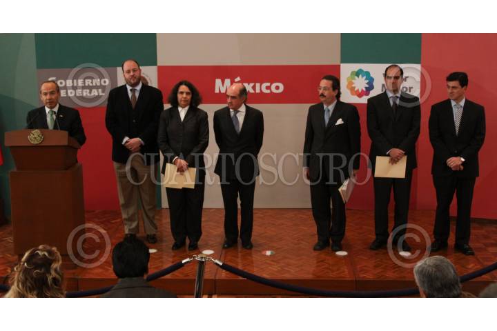 MÉXICO, D.F., 03MARZO2009.- Felipe Calderon, Presidente de México, Consuelo Sáizar Guerrero, nueva titular del CONACULTA, Sergio Vela, Luis Tellez, nuevo asesor de la Presidencia de la República, Juan Molinar Horcasitas, nuevo Secretario de Comunicaciones y Transportes, Daniel Karam Toumeh, director del Instituto Mexicano del Seguro Social y Gerónimo Gutiérrez, Subsecretario de Gobierno en la Secretaría de Gobernación, durante la conferencia de prensa en la cual se dieron a conocer los cambios en el gabinete. FOTO: SÁSHENKA GUTIÉRREZ/CUARTOSCURO.COM