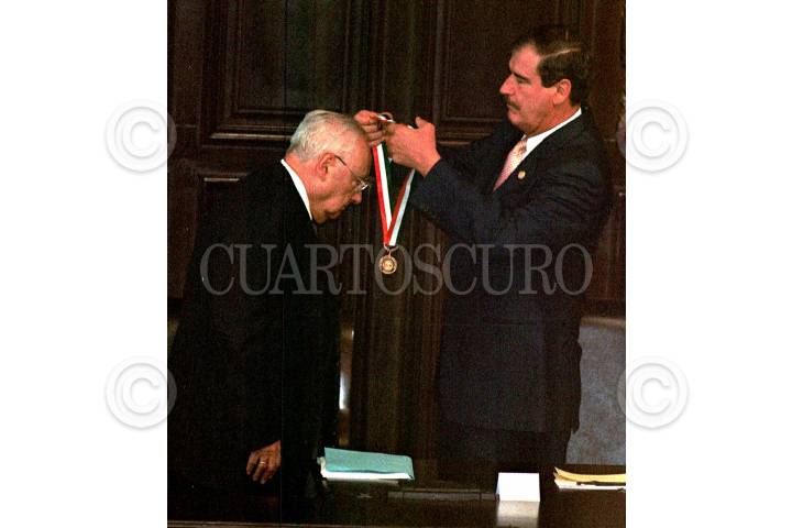 Francisco Gil Díaz, Reyes Taméz y Santiago Creel, secretarios de Economía, Educación y Gobernación respectivamente, durante el monto de guardia a la estatua de Belisario Dominguez en el Senado. FOTO: Juan Pablo Zamora/CUARTOSCURO.COM