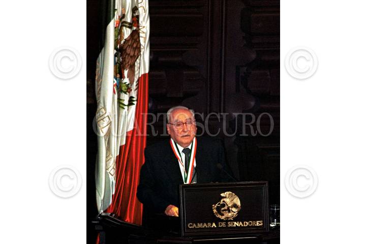 Francisco Gil Díaz, Reyes Taméz y Santiago Creel, secretarios de Economía, Educación y Gobernación respectivamente, durante el monto de guardia a la estatua de Belisario Dominguez en el Senado. FOTO: Juan Pablo Zamora/CUARTOSCURO.COM