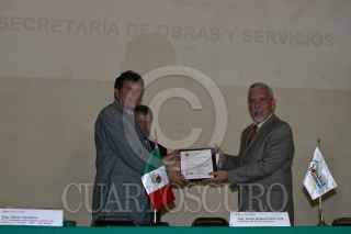 MÉXICO, D.F., 04MARZO2009.- Oscar Cardona, vicepresidente para México, Centro, Sur America y el Caribe - QMT - SAT - Globlal hace entrega a Jorge Arganiz Díaz, secretario de obras del D.F., el Certificado Internacional de Calidad ISO-9001:2000, que otorga la QMI-SAI Global al Gobierno del Distrito Federal; acto que se realizo en el ex templo de Corpus Christi. FOTO: RODOLFO ANGULO/CUARTOSCURO.COM