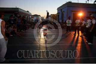 OAXACA, OAXACA, 04MARZO2009.- La onceava muestra de "Danza Contemporánea", que como ya es tradición se celebra en el zócalo de esta capital, y convoca a bailarines de distintos puntos de la país, este año una de las novedades es la disciplinas del "Break Dance", también están presentes muestras artísticas melodramáticas, coreografías o performances. FOTO: MAX NÚÑEZ/CUARTOSCURO.COM