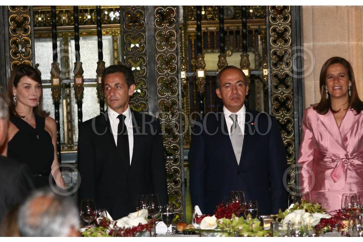 MÉXICO D.F., 09MARZO2009.- Nicolás Sarkozy, presidente de Francia y Felipe Calderón Hinojosa, presidente de México, durante el brindis en honor a la comitiva del gobierno de Francia que se llevo acabo en una cena de honor que realizó el gobierno de México en Palacio Nacional. FOTO: SAÚL LÓPEZ/CUARTOSCURO.COM