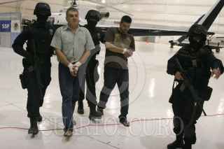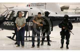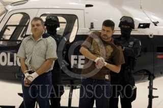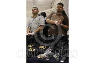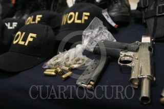 MÉXICO D.F., 09MARZO2009.- La Policía Federal presento dos presuntos secuestradores de nombres, Nezahualcoyotl Ibarra Ramos (El Coyote) y Ignacio Manjarrez (El paisano) que tenían privado de su libertad a un empresario belga, esta detención se realizo en Tajomulco en Jalisco, en su detención les aseguraron dos pistolas calibre nueve milímetros y tres teléfonos celulares ademas de gorras y playeras con la leyenda "WOLF". FOTO: RICARDO CASTELAN/CUARTOSCURO.COM