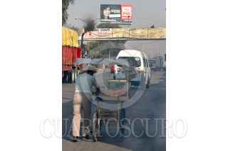 ECATEPEC, ESTADO DE MÉXICO, 11MARZO2009.- Debido a que no hay vías alternas ni banquetas apropiadas sobre la Vía José López Portillo, este comerciante tiene que circular entre combis y camiones de carga. FOTO: MARIO NULO/CUARTOSCURO.COM