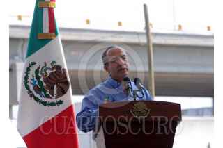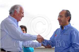 RIO VERDE, SAN LUIS POTOSI., 13MARZO2009.- Marcelo de los Santos, Gobernador del estado de San Luis Potosí en compañia de Felipe Calderón, Presidente de México durante el evento 310 millones invertidos en mas infraestructura carretera para vivir mejor que tuvo lugar en el crucero vial de Rio Verde Valles San Ciro de Acosta. FOTO: ALFREDO GUERRERO/CUARTOSCURO.COM