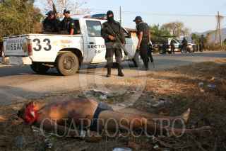 ZIHUATANEJO, GUERRERO, 13MARZO2009.- Un hombre fue encontrado ejecutado en el entronque de la comunidad San Miguelito a unos 20 metros de donde murieron calcinados cuatro policías el pasado 25 de febrero. Presentaba al menos 18 impactos de bala, estaba semi desnudo y a su alrededor fueron encontrados casquillos percutidos de arma de fuego calibre 9 milímetros. FOTO: CHUY MEZA/CUARTOSCURO.COM