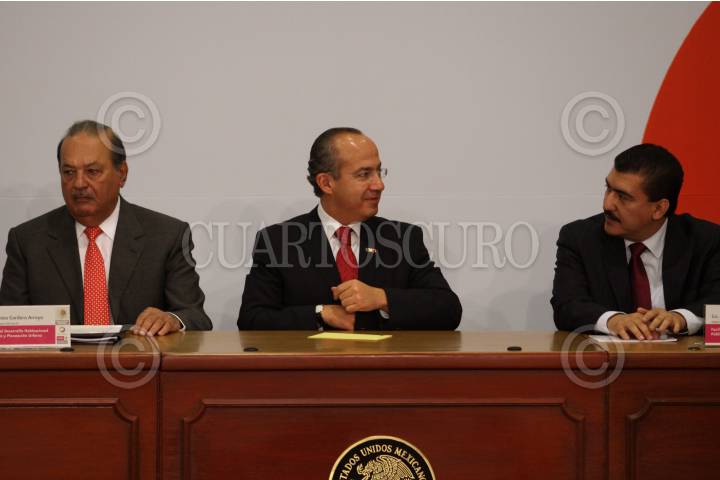MÉXICO, D.F., 13MARZO2009.- Lorenzo Zambrano, presidente ejecutivo de CEMEX y Felipe Calderón Honojosa, Presidente de México, durante la firma del Pacto Nacional por la Vivienda en la residencia de Los Pinos. FOTO: MOISÉS PABLO/CUARTOSCURO.COM