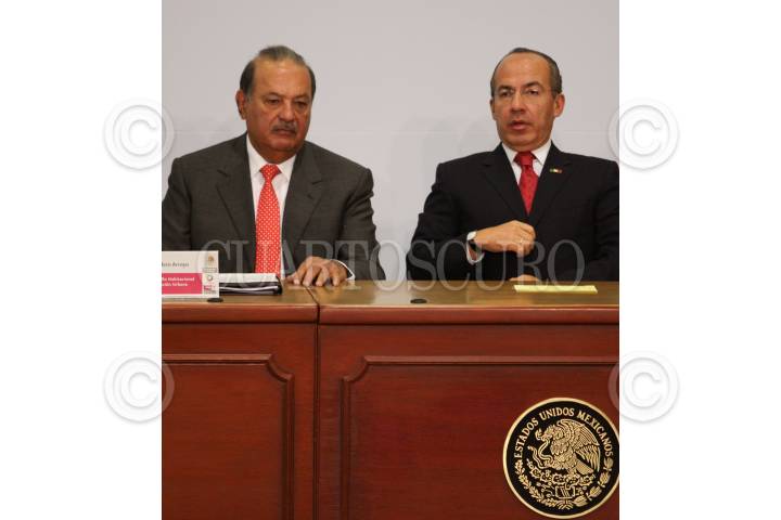 MÉXICO, D.F., 13MARZO2009.- Lorenzo Zambrano, presidente ejecutivo de CEMEX y Felipe Calderón Honojosa, Presidente de México, durante la firma del Pacto Nacional por la Vivienda en la residencia de Los Pinos. FOTO: MOISÉS PABLO/CUARTOSCURO.COM