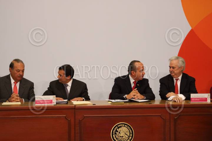 MÉXICO, D.F., 13MARZO2009.- Lorenzo Zambrano, presidente ejecutivo de CEMEX y Felipe Calderón Honojosa, Presidente de México, durante la firma del Pacto Nacional por la Vivienda en la residencia de Los Pinos. FOTO: MOISÉS PABLO/CUARTOSCURO.COM