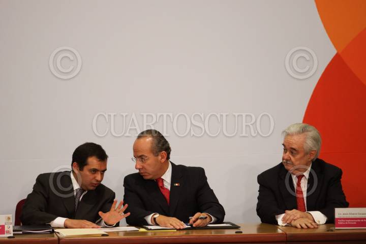 MÉXICO, D.F., 13MARZO2009.- Lorenzo Zambrano, presidente ejecutivo de CEMEX y Felipe Calderón Honojosa, Presidente de México, durante la firma del Pacto Nacional por la Vivienda en la residencia de Los Pinos. FOTO: MOISÉS PABLO/CUARTOSCURO.COM