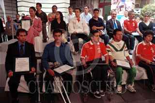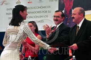 Reyes Tamez Guerra, titular de la Secretaría de Educación Pública, entrega su reconocimiento a Lucia Sosa, atleta paraplejica, esta tarde en las instalaciones de esta dependencia. FOTO: Susana Navarrete/CUARTOSCURO.COM