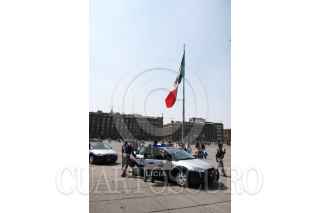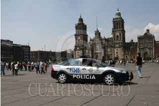 MÉXICO D.F., 16MARZO2009.- Elementos de suguridad pública suben al interior de la plancha del Zócalo, la patrulla para realizar la detención de un par de vendedores ambulantes. FOTO: GUILLERMO PEREA/CUARTOSCURO.COM