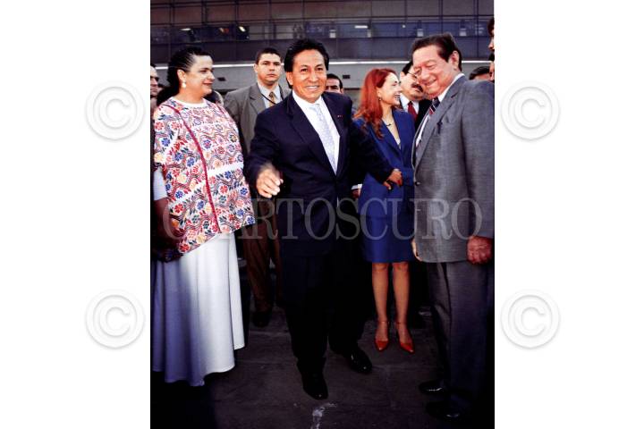 Alejandro Toledo, ganador de las elecciones presidenciales del 3 de junio de 2001 en Perú, a su salida de salón de Protocolo de la Cámara de Diputados, en compañia de su esposa Eliane Karp de Toledo, Beatriz Paredes, presidenta de la mesa directiva de la Cámara Baja, y Rafael Rodriguez Barera, coordinador de la bancada Priístas. FOTO: Susana Navarrete/CUARTOSCURO.COM