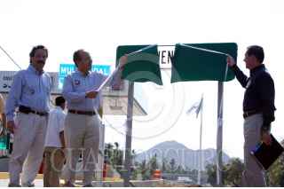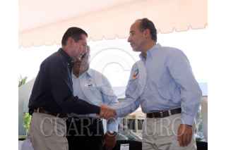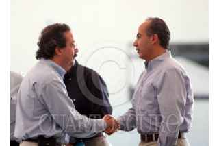 TECPAN DE GALEANA, GUERRERO, 20MARZO2009.- El titular de la Secretaría de Comunicaciones y Transportes, Juan Molinar Horcasitas, saluda al presidente de México, Felipe Calderón Hinojosa, durante la inauguración del libramiento "Tecpan de Galeana", que se realizó en esta entidad. FOTO: ALFREDO GUERRERO/CUARTOSCURO.COM