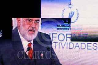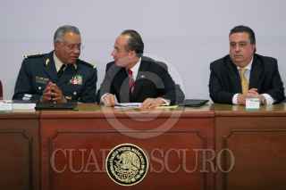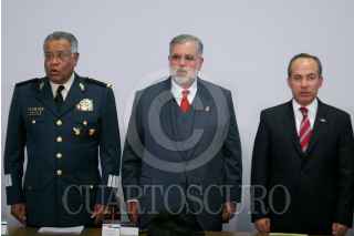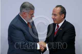 MÉXICO, D.F., 20MARZO2009.- José Luis Soberanes, titular de la Comisión Nacional de Derechos Humanos y el presidente de México, Felipe Calderon Hinojosa durante la entrega del informe de actividades de el ombudsman, donde anuncio su pronto retiro de este cargo. FOTO: RICARDO CASTELAN/CUARTOSCURO