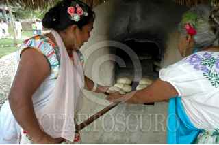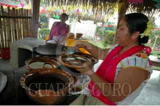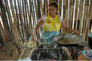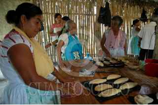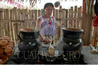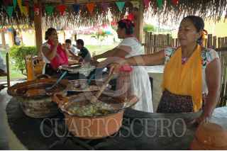 PAPANTLA, VERACRUZ, 20MARZO2009.- Mujeres indígenas preparan la comida al estilo tradicional de sus comunidades totonacas dentro del nicho de aromas y sabores para la degustación de los asistentes a Cumbre Tajín 2009 y que se realiza en el parque temático Takilhsukut del 18 al 22 de marzo. FOTO: RODOLFO ANGULO/CUARTOSCURO.COM