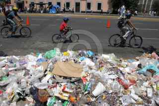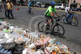 MÉXICO, D.F., 22MARZO2009.- Cientos de personas acuden a la Avenida Paseo de la Reforma para ejercitarse y practicar deporte al aire libre, durante el programa denominado Ciclotón, a un costado de la Alameda central un gran montón de basura desprendía muy mal olor provocando malestar a los ciclistas que pasaban por este lugar FOTO: RICARDO CASTELAN/CUARTOSCURO.COM