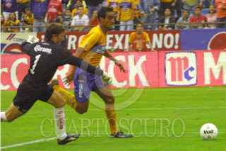 Hernán Cristante, portero del Toluca, sale de la meta durante en una llegada de Tigres en el partido que termino empatado a dos. FOTO: PEDRO VALTIERRA/CUARTOSCURO.COM