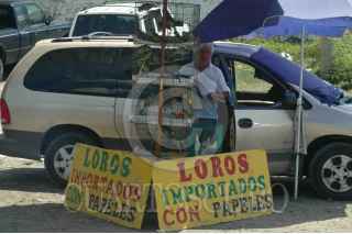 POZA RICA, VERACRUZ, 23MARZO2009.- Los pericos de México están seriamente amenazados con la extinción, el trafico ilegal así como la destrucción de su hábitat son las principales causas del deterioro de las poblaciones silvestres; la venta ilegal de pericos silvestres esta prohibida por la Ley General de Vida Silvestre y a su vez se considera un delito federal que conlleva a una pena de hasta 9 años o 12 de prisión. En la imagen una persona vende loros y pericos importados y supuestamente con papeles a la orilla de la carretera. FOTO: RODOLFO ANGULO/CUARTOSCURO.COM