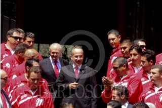 MÉXICO, D.F., 24MARZO2009.- Felipe Calderon Hinojosa Presidente de México platica con jugadores de los Diablos Rojos de Mexico los cuales fueron recibidos por el mandatario en las escalinatas de la residencia oficial de los Pinos al equipo de béisbol Diablos Rojos de México FORO: SÁSHENKA GUTIERREZ/CUARTOSCURO.COM