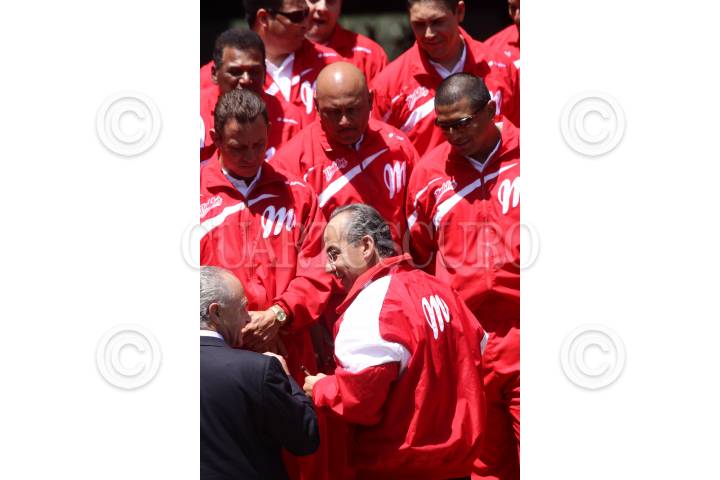 MÉXICO, D.F., 24MARZO2009.- Felipe Calderon Hinojosa Presidente de México platica con jugadores de los Diablos Rojos de Mexico los cuales fueron recibidos por el mandatario en las escalinatas de la residencia oficial de los Pinos al equipo de béisbol Diablos Rojos de México FORO: SÁSHENKA GUTIERREZ/CUARTOSCURO.COM