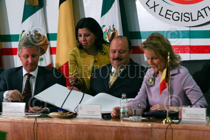 MÉXICO D.F., 24MARZO2009.- El diputado del PRI, Cesar Duarte Jáquez, presidente de la mesa directiva de la Cámara de Diputados, acompañado de Javier González Garza y del Emilio Gamboa Patrón, diputado del PRI, dio la bienvenida en ceremonia oficial a Philippe y Matilhde, príncipes de Bélgica, en la Cámara de Diputados donde realizaron un recorrido por el recinto legislativo. FOTO: GUILLERMO PEREA/CUARTOSCURO.COM