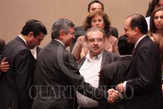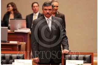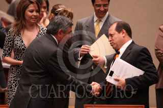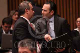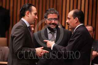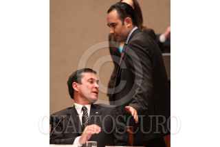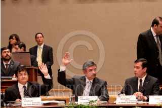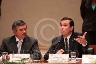 MÉXICO D.F., 24MARZO2009.- Edmundo Jacobo Molina, secretario ejecutivo y Roberto Gil Zuarth, representante panista, durante la sesión extraordinaria en la cual se discutió el dictamen modificado que reduce casi a la mitad la multa originalmente aplicada a Televisión Azteca y TV Azteca –dos razones sociales de la televisora del Ajusco– con 4 millones de pesos. En este nuevo dictamen se eliminó, entre otros aspectos, el carácter de reincidente en la comisión de irregularidades relacionadas con la transmisión de espots electorales. FOTO: MOISÉS PABLO/CUARTOSCURO.COM