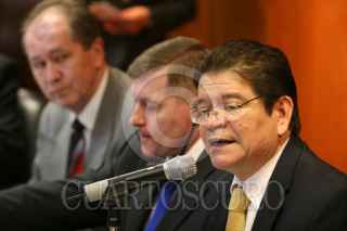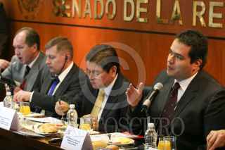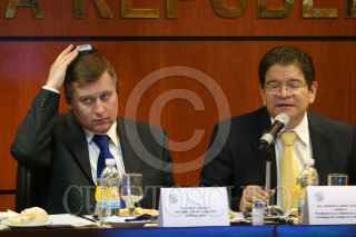 MÉXICO D.F., 25MARZO2009.- Alexander Konakhin, coordinador de proyectos de américa latina en la agencia espacial rusa, Sergey Savelev director de la agencia espacial rusa, el senador Fransisco Javier Castellón, presidente de la comisión de Ciencia y Tecnología en el senado y Fernado de la Peña promotor de la agencia espacial de México, durante una reunión con especialistas de la agencia espacial rusa. FOTO: RICARDO CASTELAN/CUARTOSCURO.COM