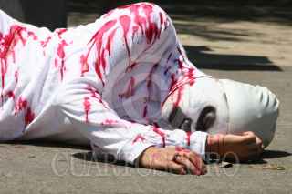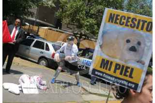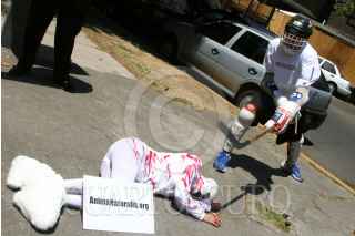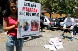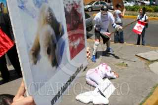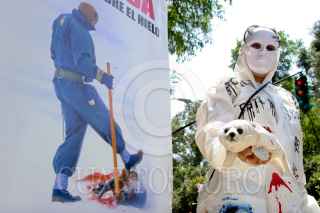 MÉXICO, D.F., 26MARZO2009.- Miembros de AnimaNaturalis, se protestaron a las afueras de la embajada de Canadá, esto para manifestase en contra de la caza masiva de focas que se realiza en este pais, en el mismo evento anunciaron que lanzaran una campaña internacional masiva para boicotear los juegos olímpicos de invierno que se realizaran en Vancouver en el 2010 si es que el gobierno canadiese continua con esta caza sanguinaria de focas. FOTO: RICARDO CASTELAN/CUARTOSCURO.COM