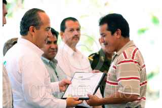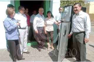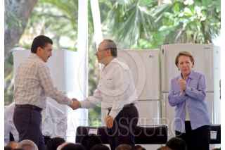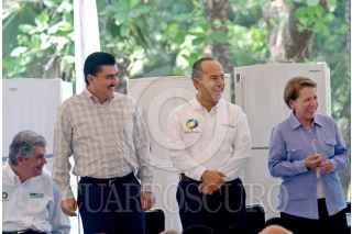 COLIMA, COLIMA 26MARZO2009.- El presidente de México, Felipe Calderón Hinojosa, en compañía con el gobernador del estado, Jesús Silverio Cavazos Ceballos y la Secretaría de Energía, Georgina Kessel, durante el programa social; "Cambia tu viejo por uno nuevo". El cual se trata de cambiar refrigeradores viejos por nuevos, para así ahorrar energía. FOTO: ALFREDO GUERRERO/CUARTOSCURO.COM