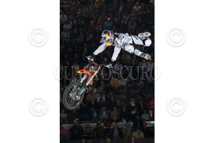 MÉXICO, D.F., 27MARZO2009.- El piloto mexicano Johan Nungaray realiza un salto durante la competencia del Red Bull X Fighters el cual fue descalificado en la primera ronda de la competencia internacional de motorcross estilo libre que se realizo en la plaza de Toros México. FOTO: RODOLFO ANGULO/CUARTOSCURO.COM