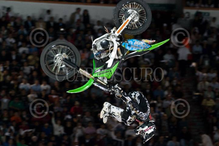 MÉXICO, D.F., 27MARZO2009.- El piloto mexicano Johan Nungaray realiza un salto durante la competencia del Red Bull X Fighters el cual fue descalificado en la primera ronda de la competencia internacional de motorcross estilo libre que se realizo en la plaza de Toros México. FOTO: RODOLFO ANGULO/CUARTOSCURO.COM