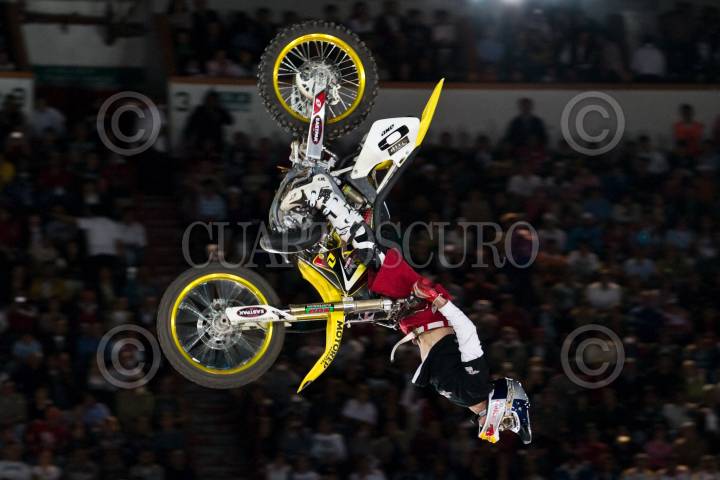 MÉXICO, D.F., 27MARZO2009.- El piloto mexicano Johan Nungaray realiza un salto durante la competencia del Red Bull X Fighters el cual fue descalificado en la primera ronda de la competencia internacional de motorcross estilo libre que se realizo en la plaza de Toros México. FOTO: RODOLFO ANGULO/CUARTOSCURO.COM