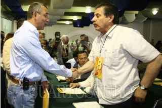 MÉXICO D.F. 28MARZO2009.- Mario Moreno Conrado, candidato a diputado federal, saluda a Jesús Ortega, dirigente nacional perredista, durante el Segundo Pleno Extraordinario Electivo del VII Consejo Nacional del PRD. FOTO: CUARTOSCURO.COM