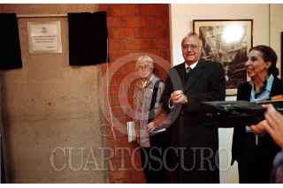 Enrique González Torres, Rector de la IBERO, la fotógrafa Paulina Lavista y Colette Alvarez Urbajtel, viuda de Manuel Alvarez Bravo, durante la develación de la placa conmemorativa que bautiza los laboratorios de fotografía la IBERO, con el nombre de don Manuel Alvarez Bravo" FOTO: Pedro Valtierra/CUARTOSCURO.COM