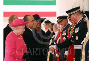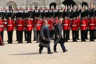 LONDRES, INGLATERRA, 30MARZO2009.- La Reyna Isabel II, Felipe Calderón Hinojosa, presidente de México y su esposa, Margarita Zavala; durante la ceremonia de bienvenida del cual fuéron objeto de reconociemiento por por su visita de estado que realiá en este país. Ésto sucedió en la explanada Horse Guards Parade del Palacio de Buckingham. FOTO: ARIEL GUTIERREZ/CUARTOSCURO.COM