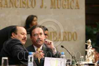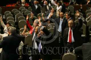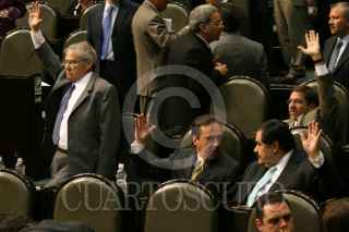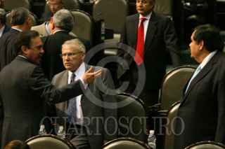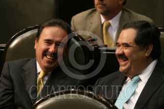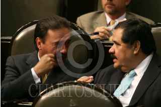 MÉXICO D.F., 02ABRIL2009.- El diputado del PRI, Emilio Gamboa Patrón, dialoga con el diputado, César Duarte Jáquez, durante la sesión ordinaria en la Cámara de Diputados, donde fue aprobado por unanimidad las adiciones al Código Penal Federal, esto con el fin de proteger el ejercicio de la libertad de expresión y agilizar la investigación de agresiones contra periodistas. FOTO: GUILLERMO PEREA/CUARTOSCURO.COM
